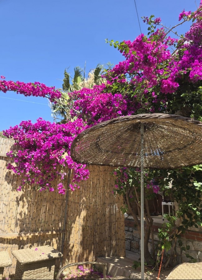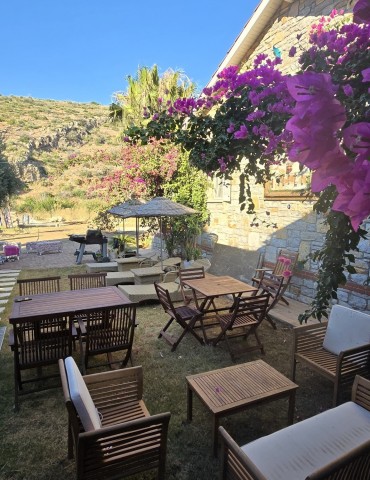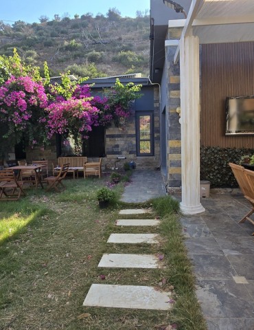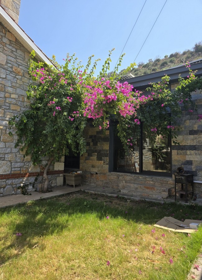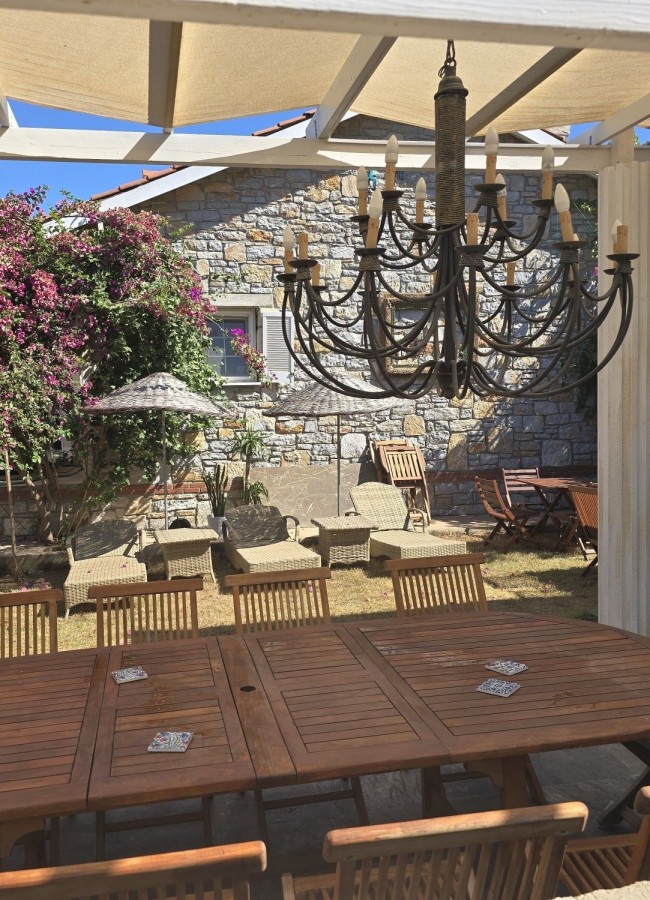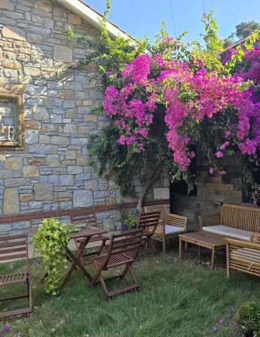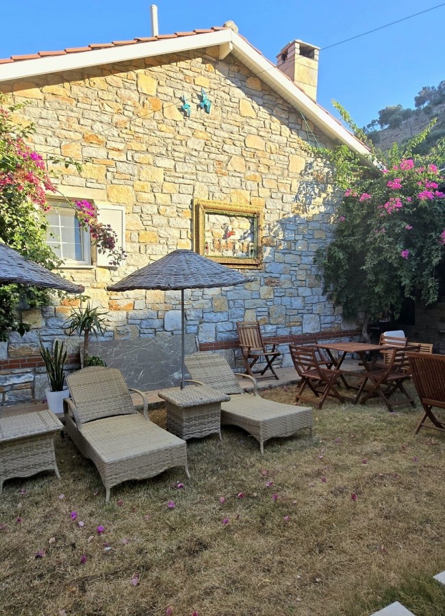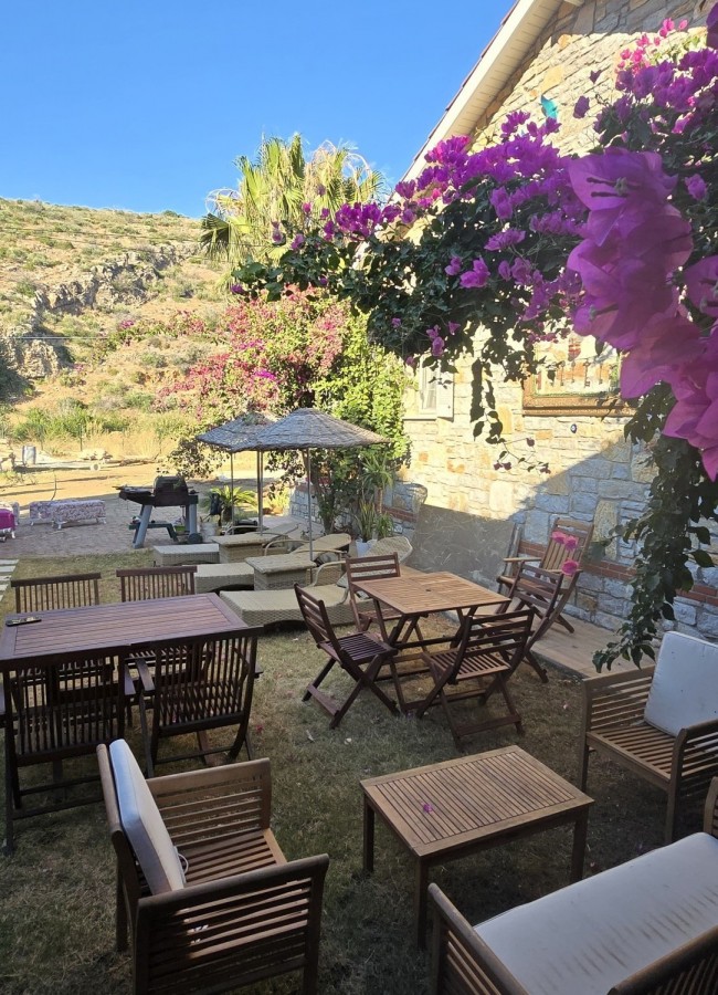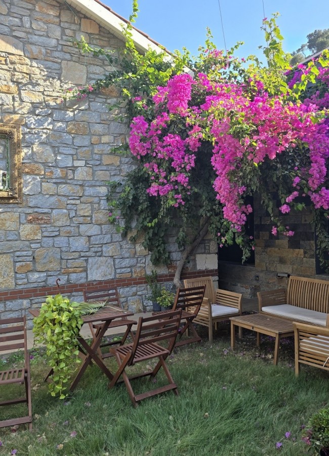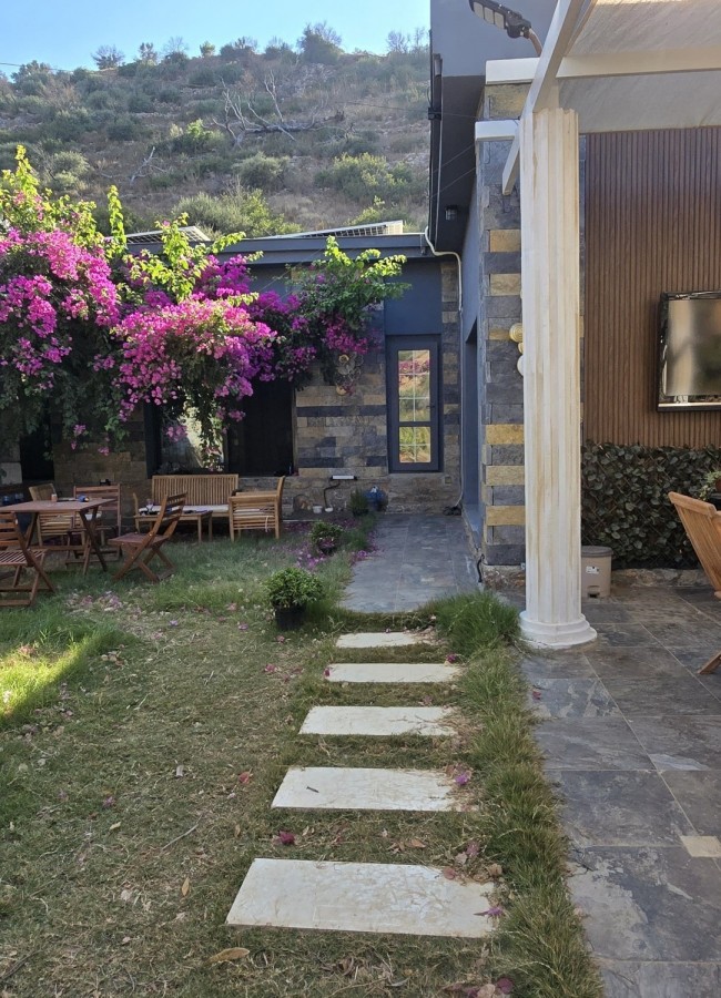 | Dış Alan ve Mimari | Geleneksel taş mimari dokusu ve bağımsız giriş imkanı. Begonvillerle çevrili bahçede pergola altı dinlenme ve yemek alanları. |