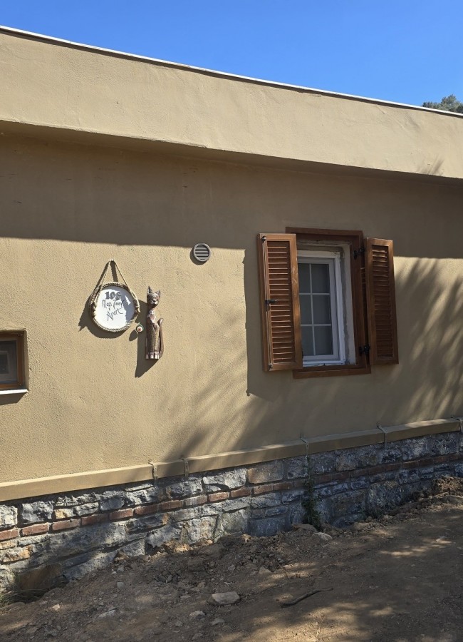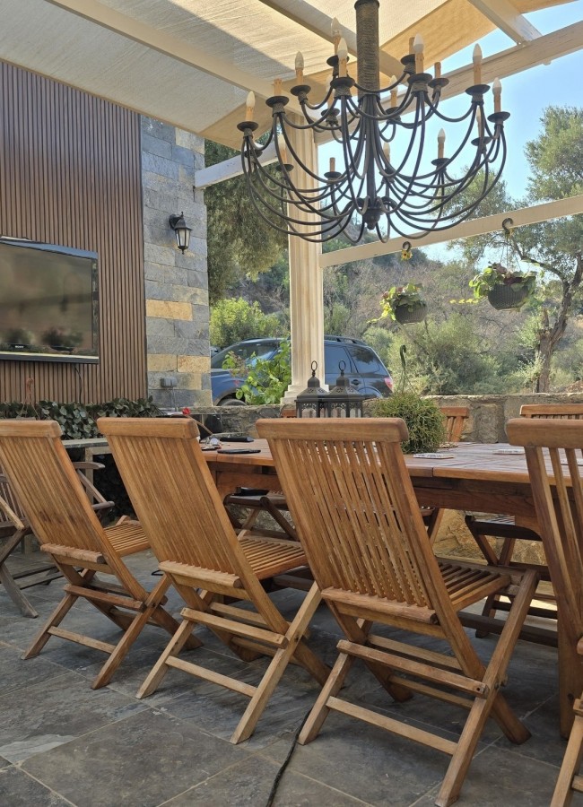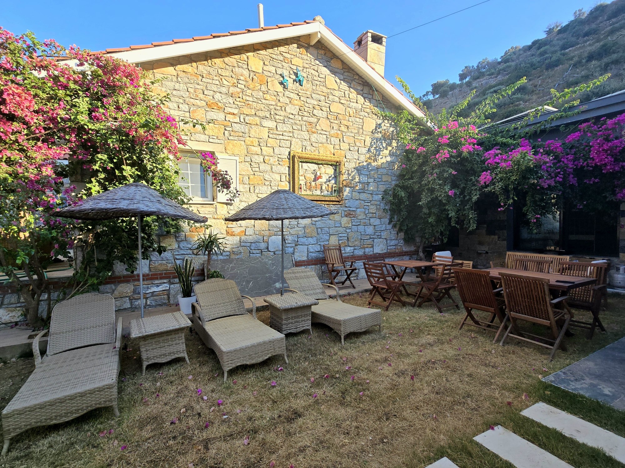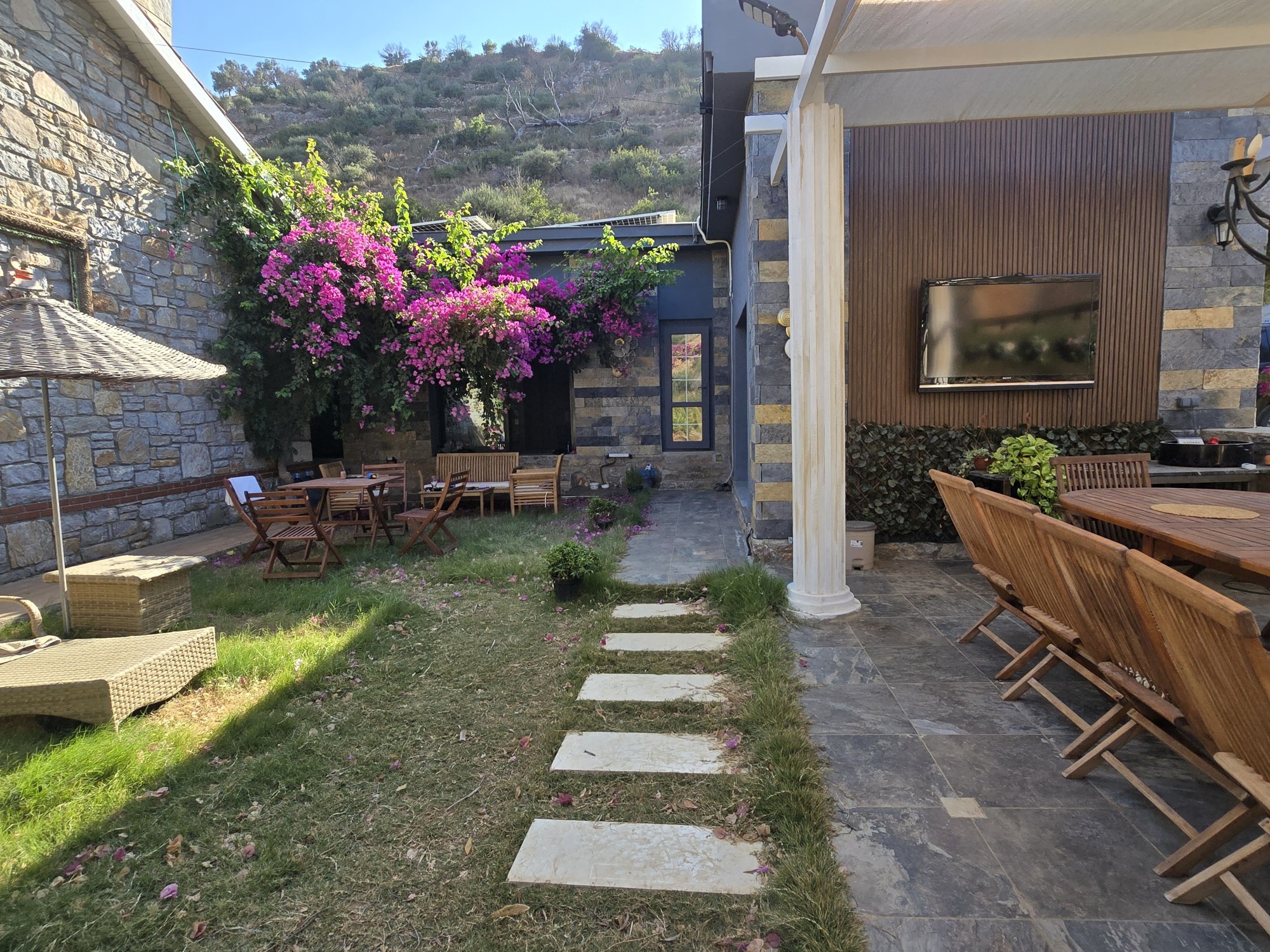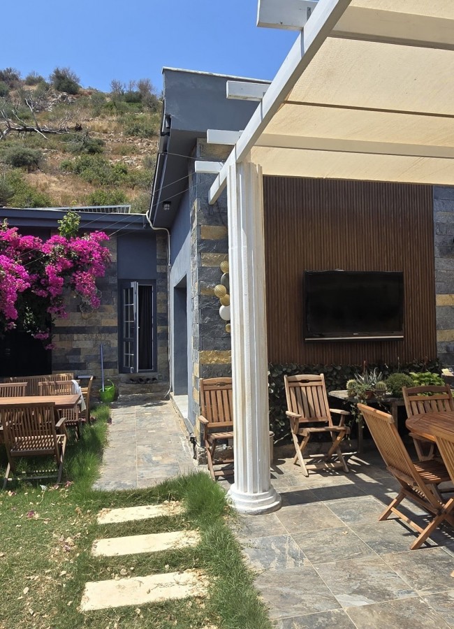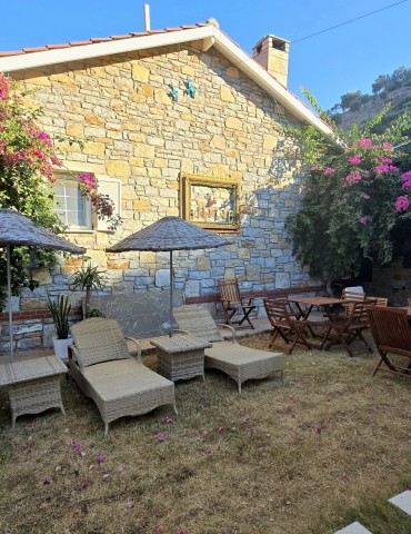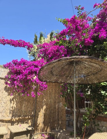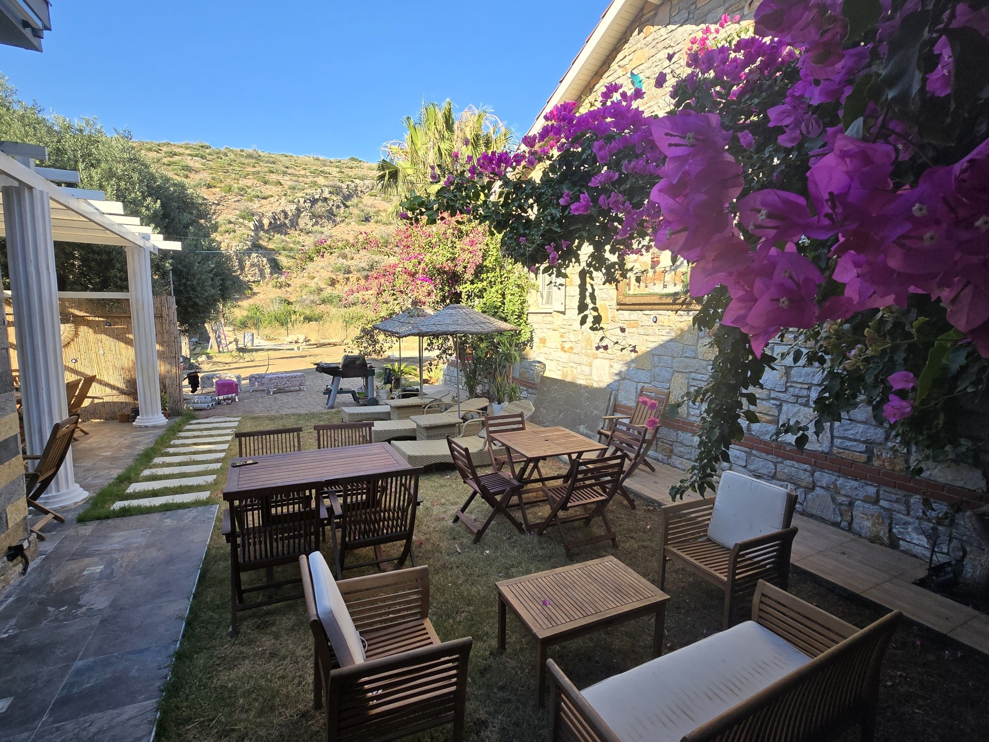 | Dış Alan ve Mimari | Geleneksel taş mimari dokusu ve bağımsız giriş imkanı. Begonvillerle çevrili bahçede pergola altı dinlenme ve yemek alanları. |