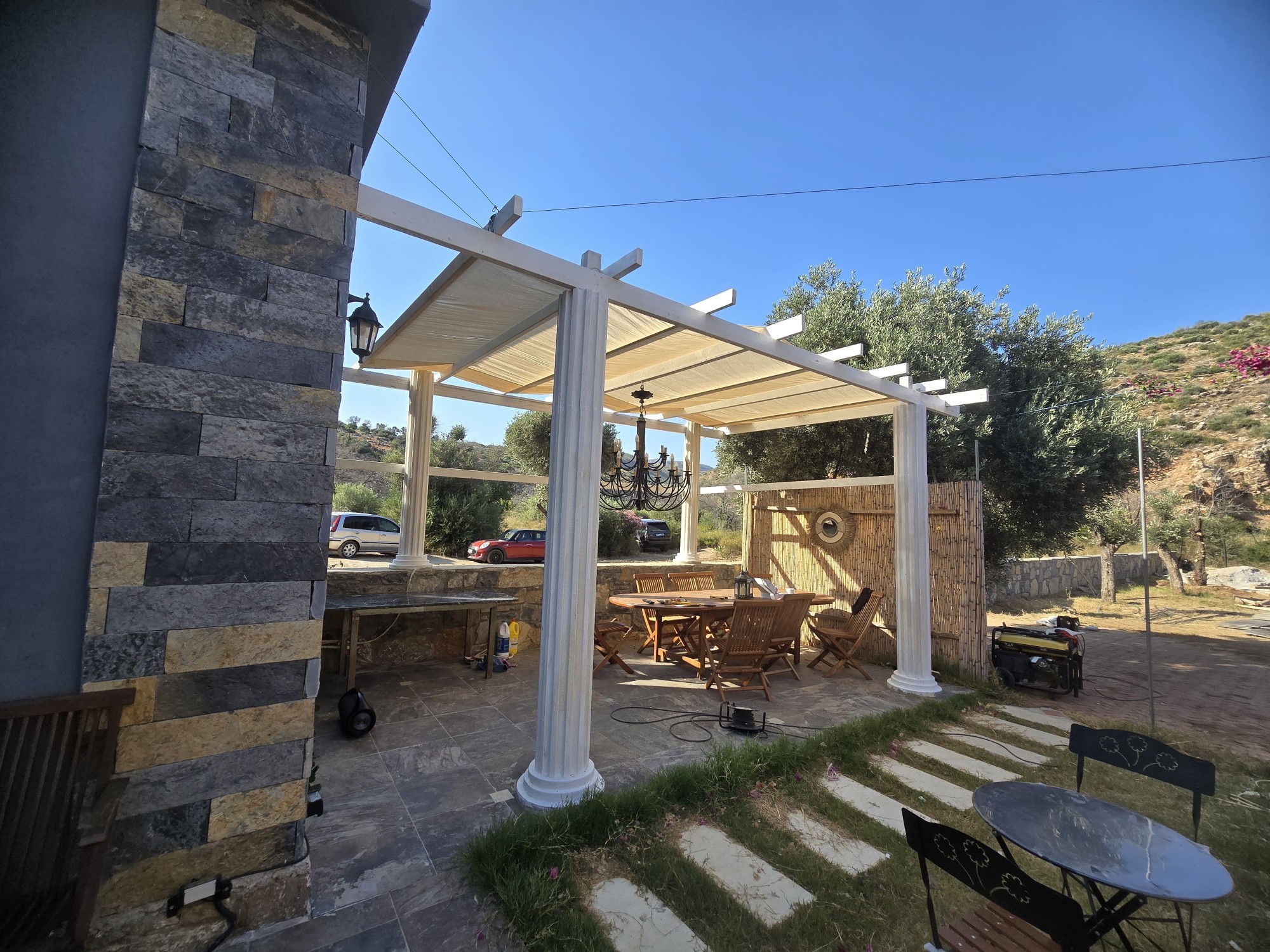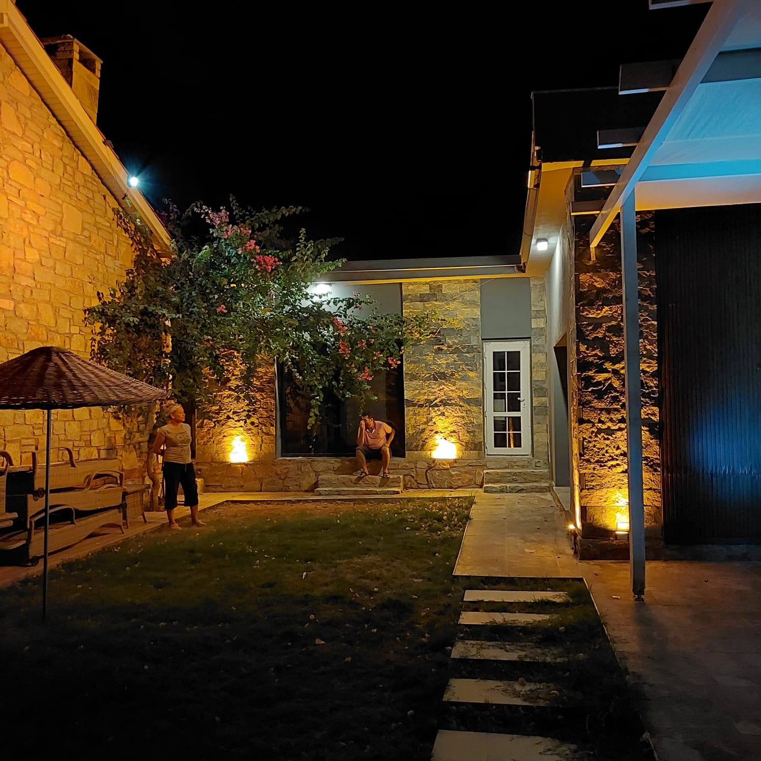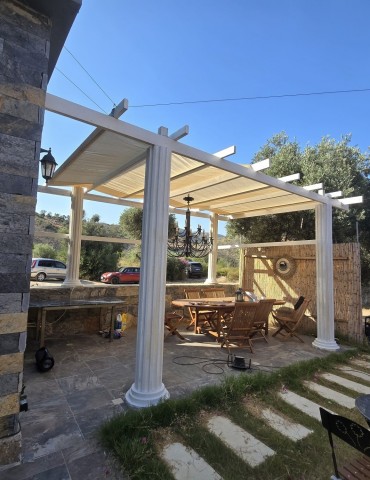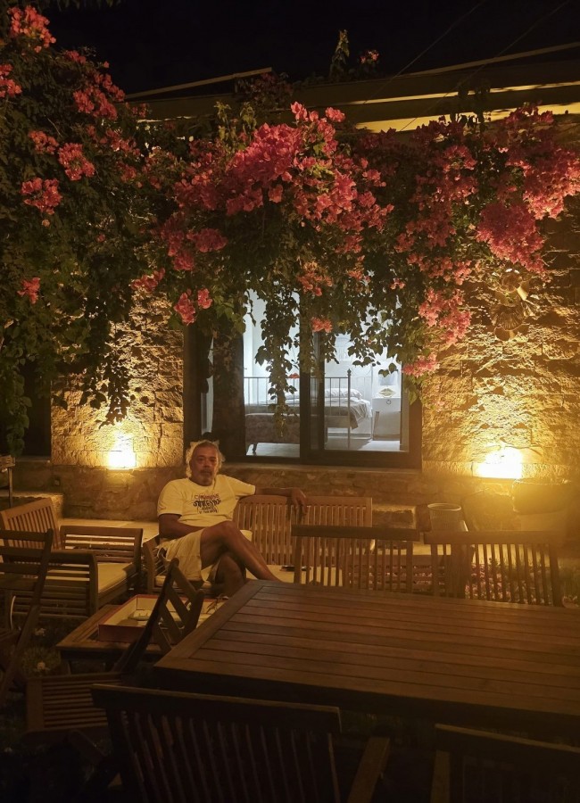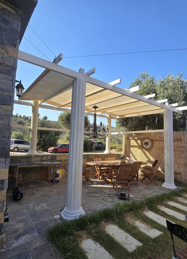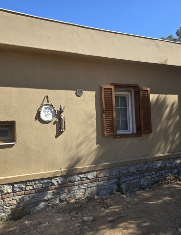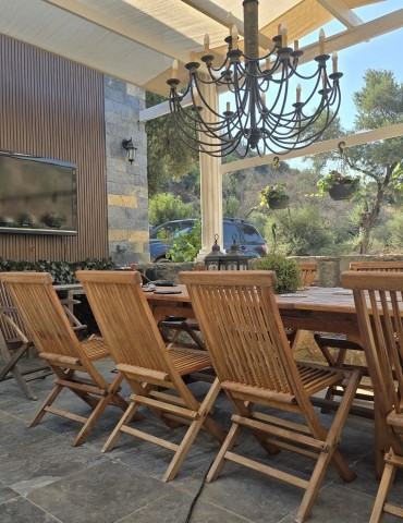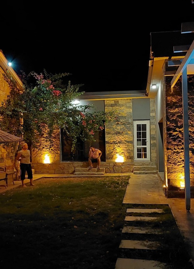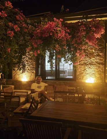 | Dış Alan ve Mimari | Geleneksel taş mimari dokusu ve bağımsız giriş imkanı. Begonvillerle çevrili bahçede pergola altı dinlenme ve yemek alanları. |