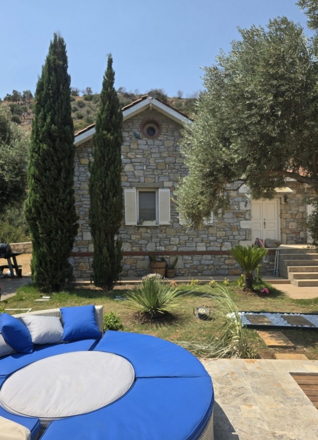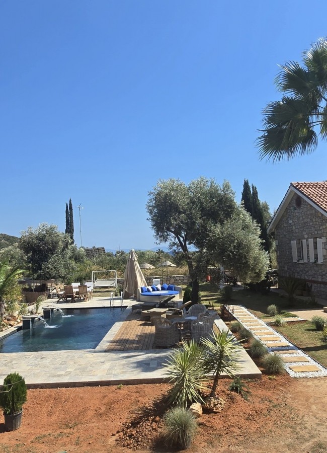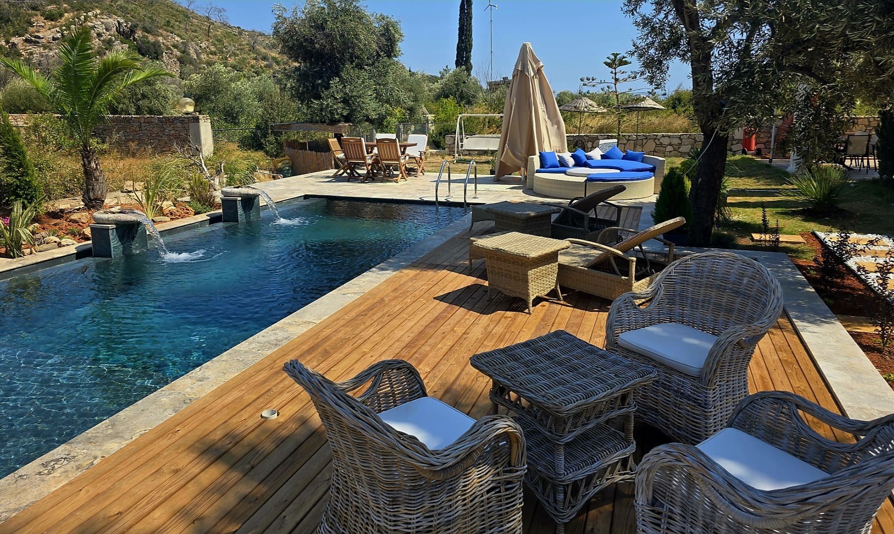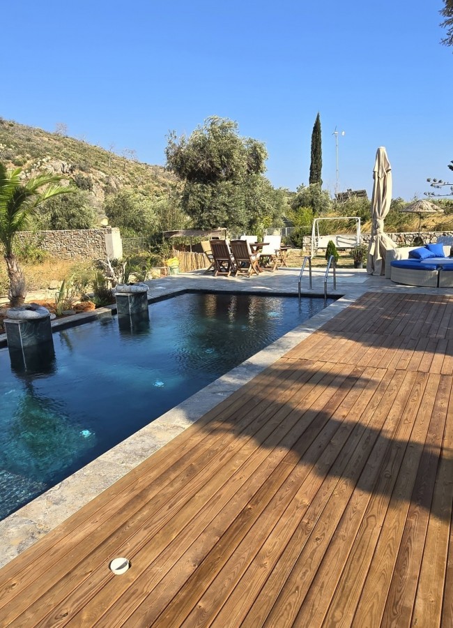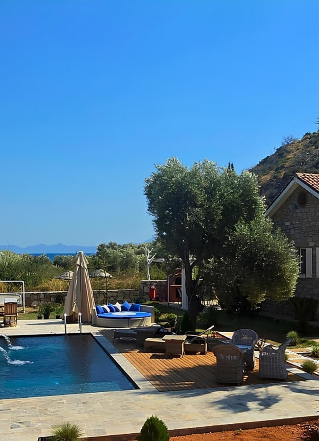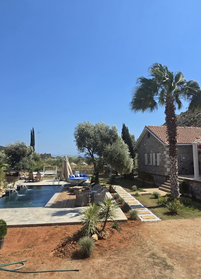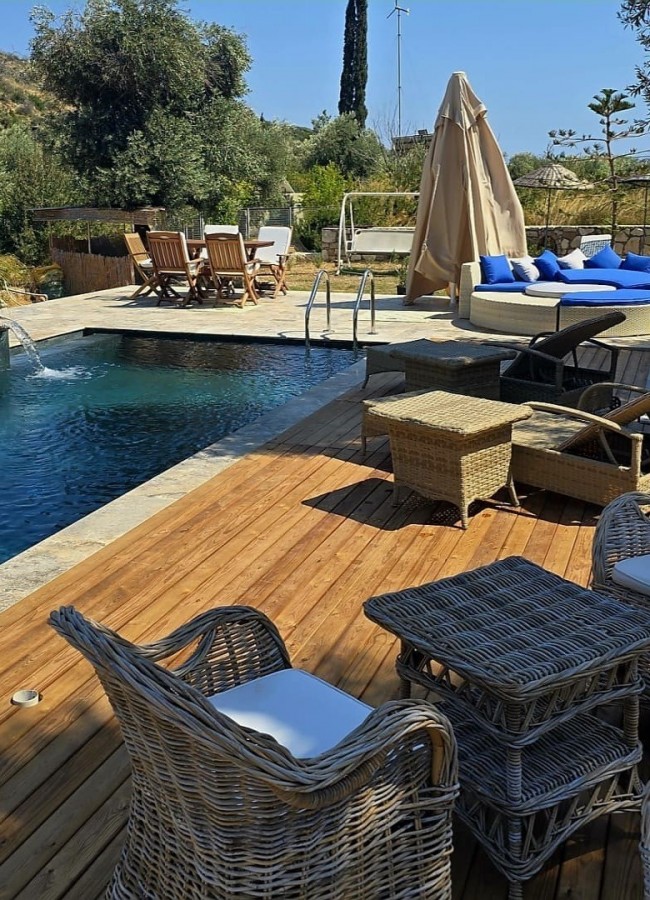 | Bahçe ve Havuz | 1.5 Dönüm arazi içinde 50 yıllık zeytin ağaçları ve begonvillerle çevrilidir. Özel şelale detaylı yüzme havuzu ve geniş ahşap deck alanı mevcuttur. |