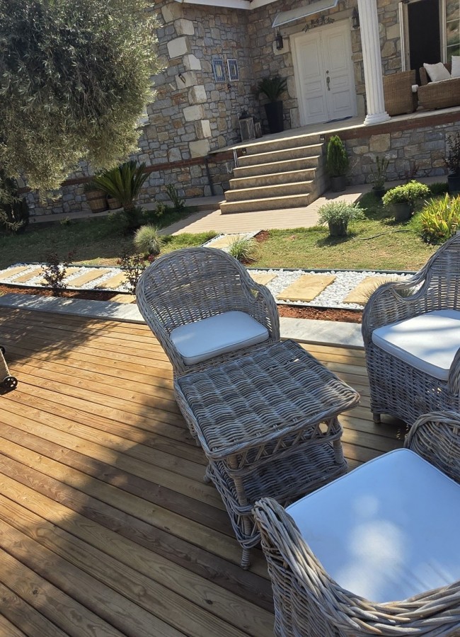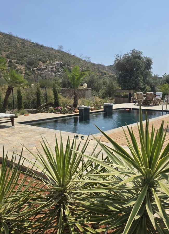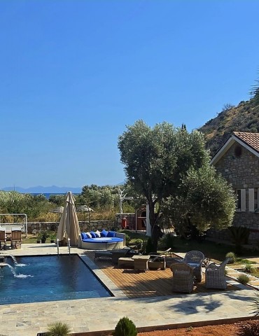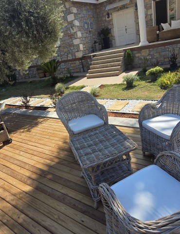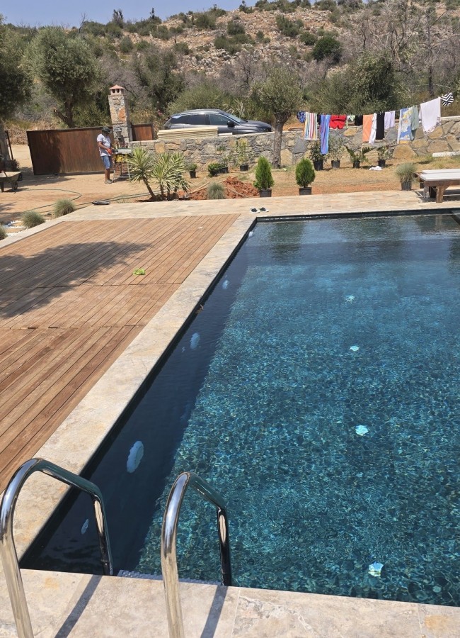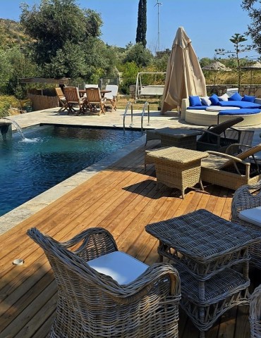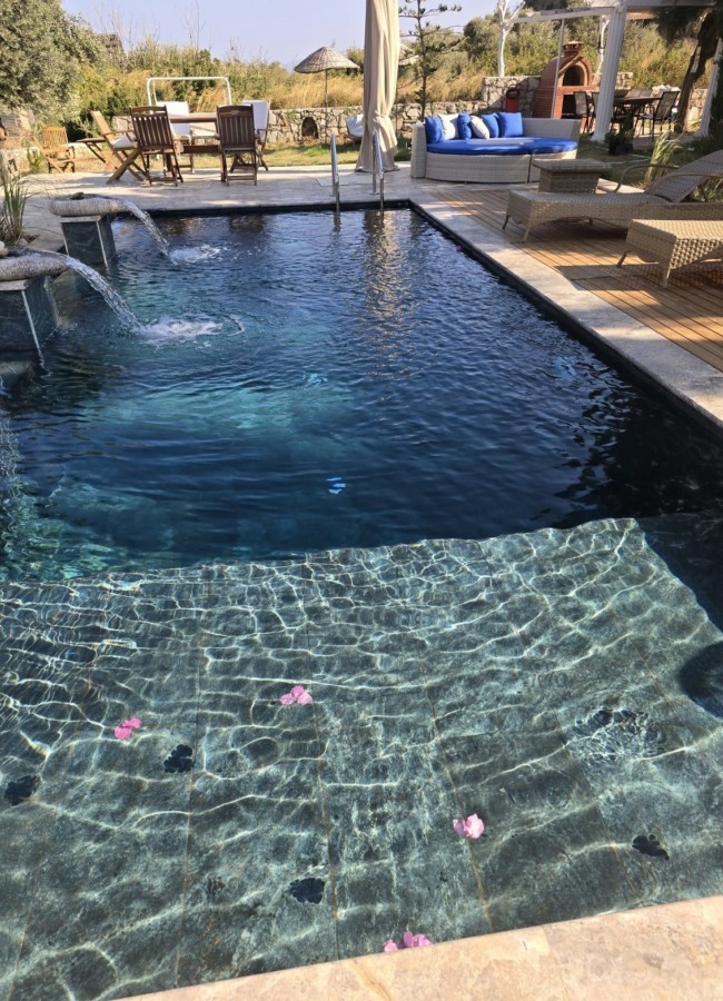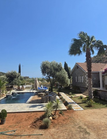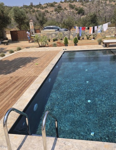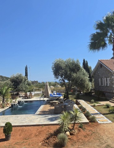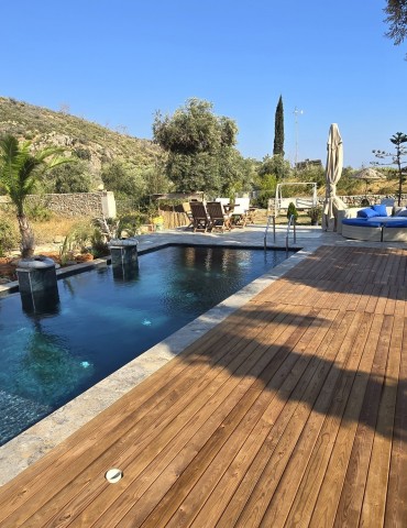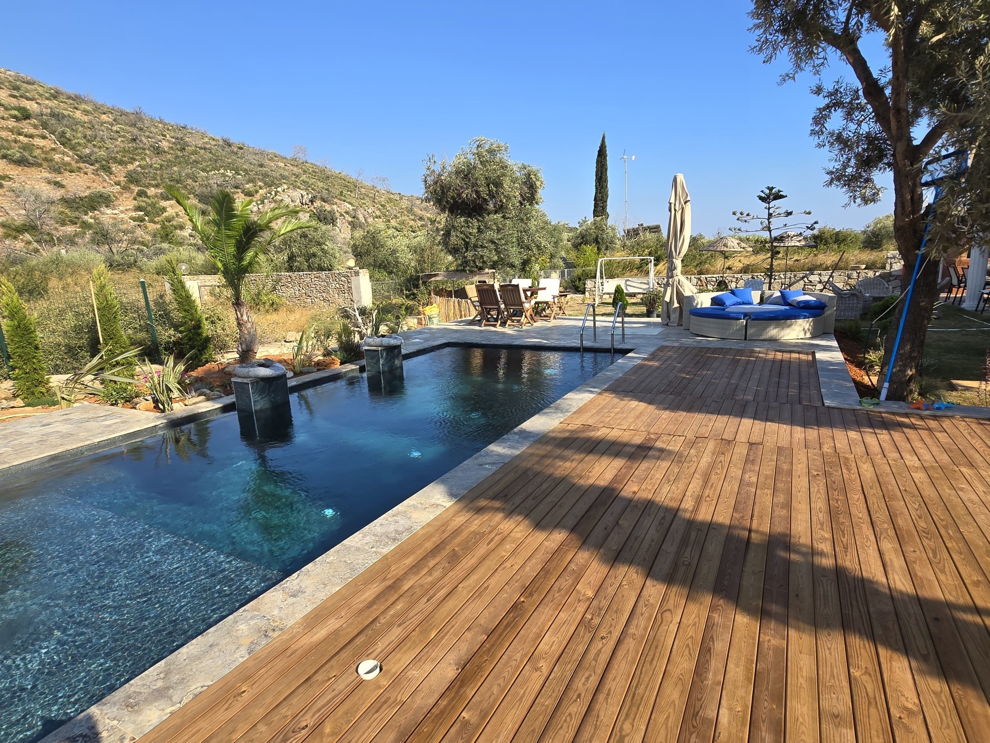| Bahçe ve Havuz | 1.5 Dönüm arazi içinde 50 yıllık zeytin ağaçları ve begonvillerle çevrilidir. Özel şelale detaylı yüzme havuzu ve geniş ahşap deck alanı mevcuttur. |