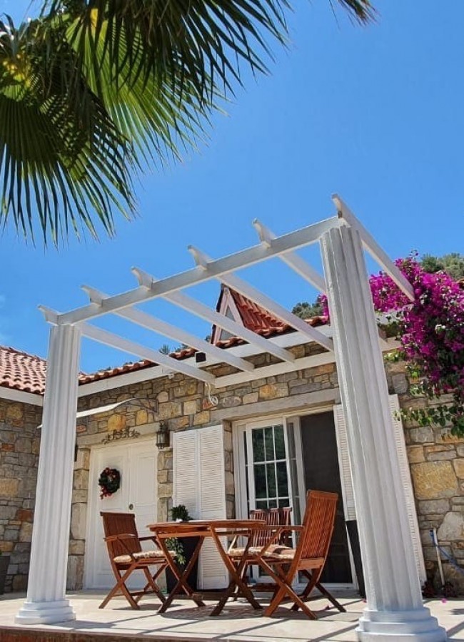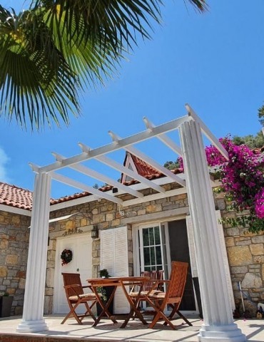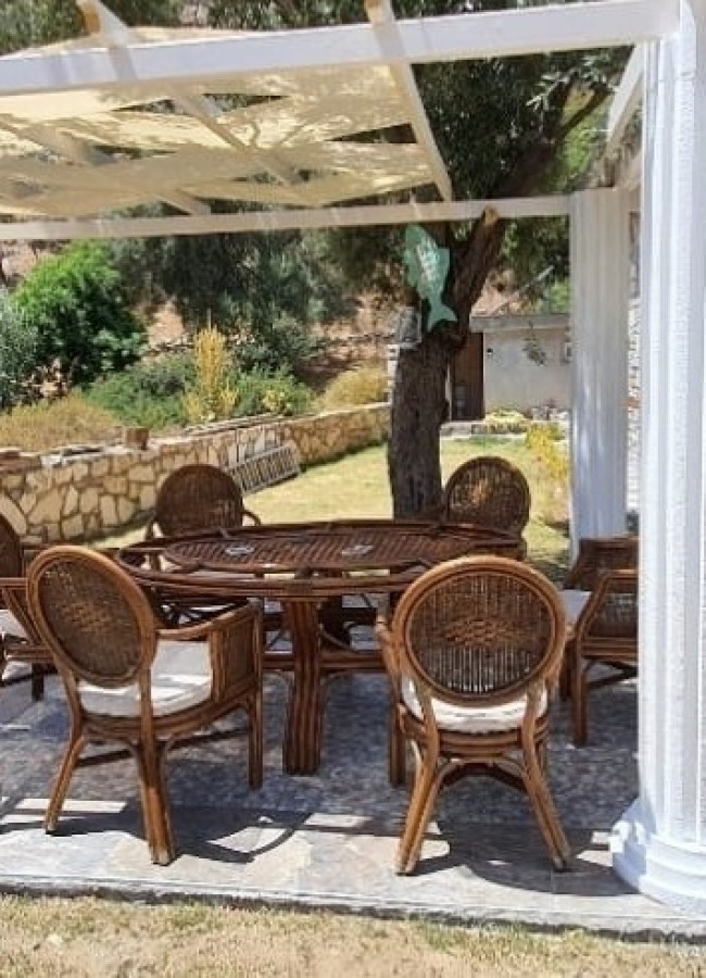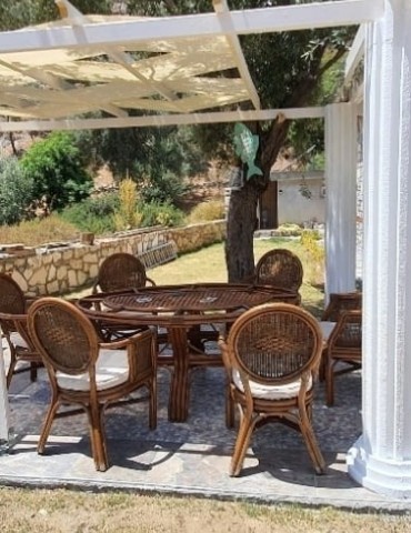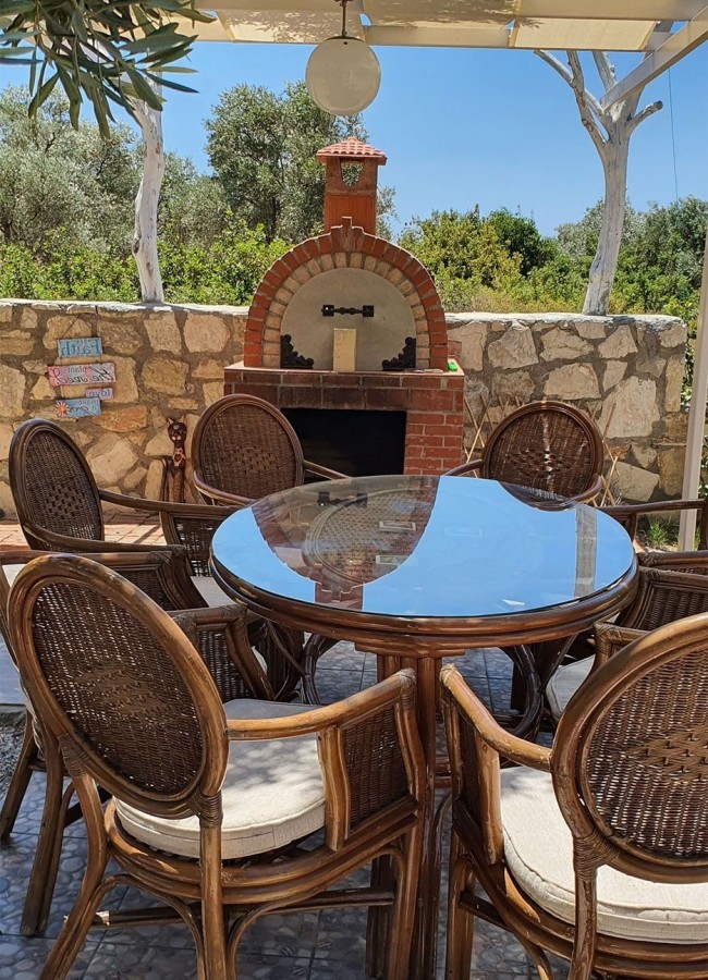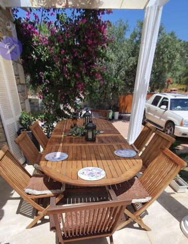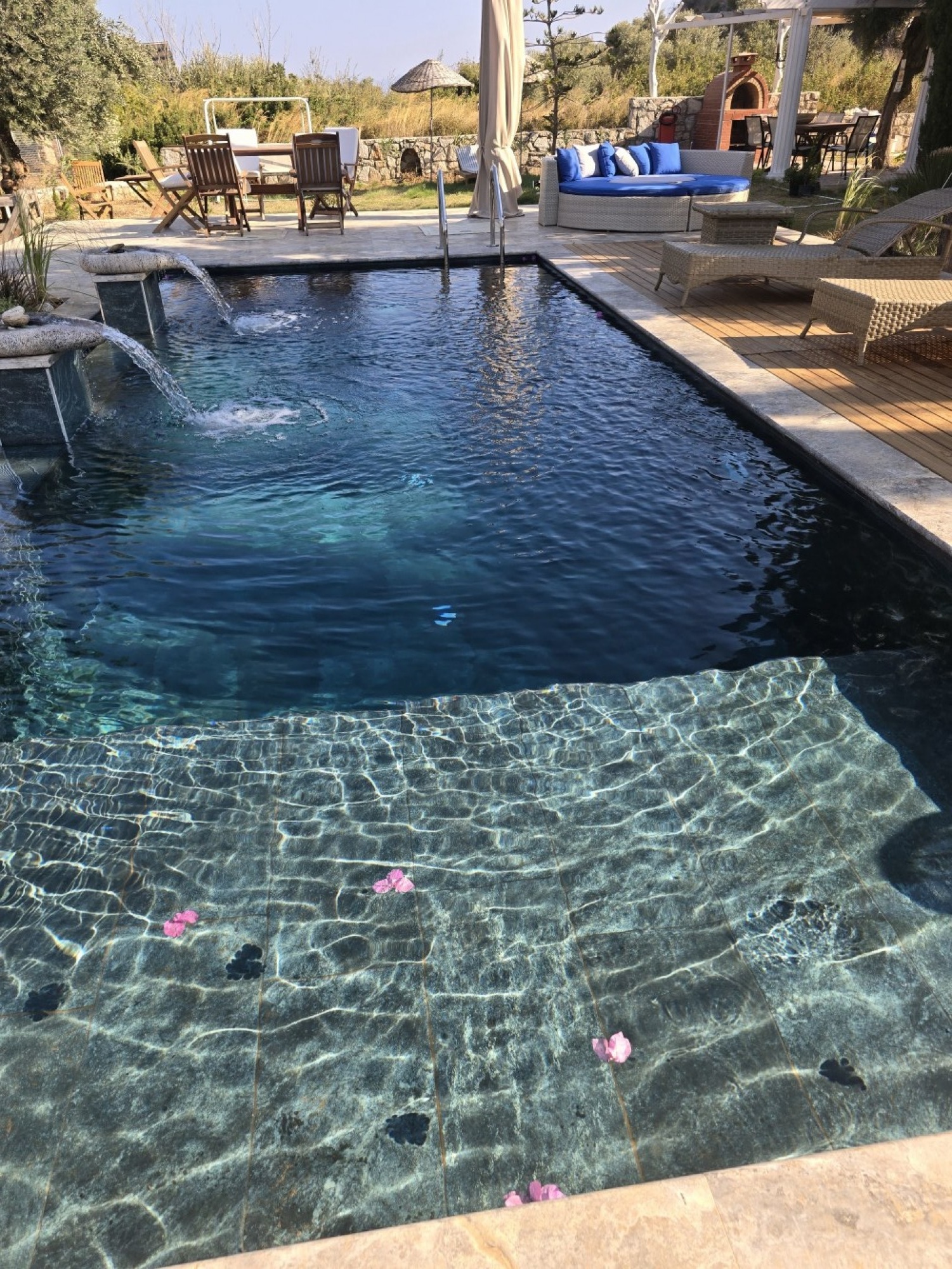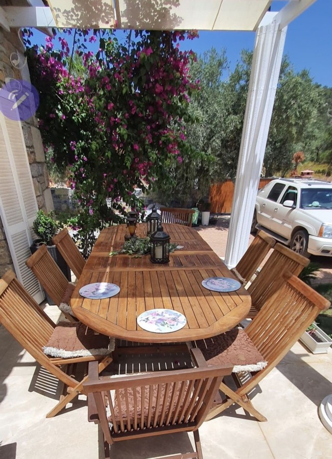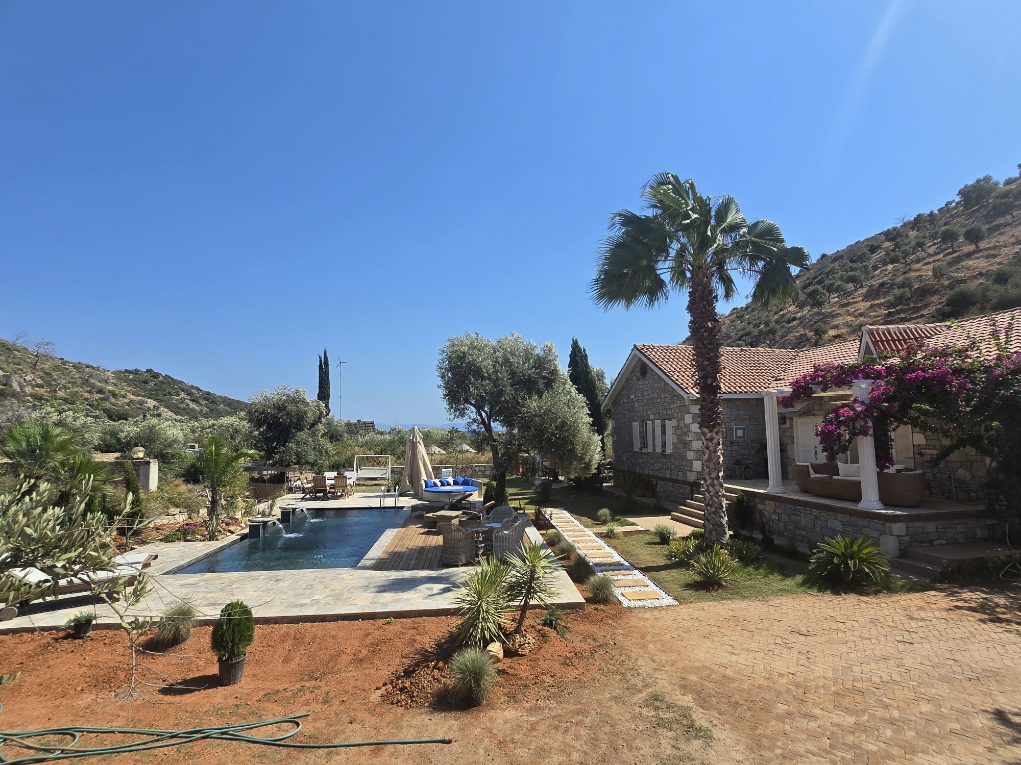 | Bahçe ve Havuz | 1.5 Dönüm arazi içinde 50 yıllık zeytin ağaçları ve begonvillerle çevrilidir. Özel şelale detaylı yüzme havuzu ve geniş ahşap deck alanı mevcuttur. |